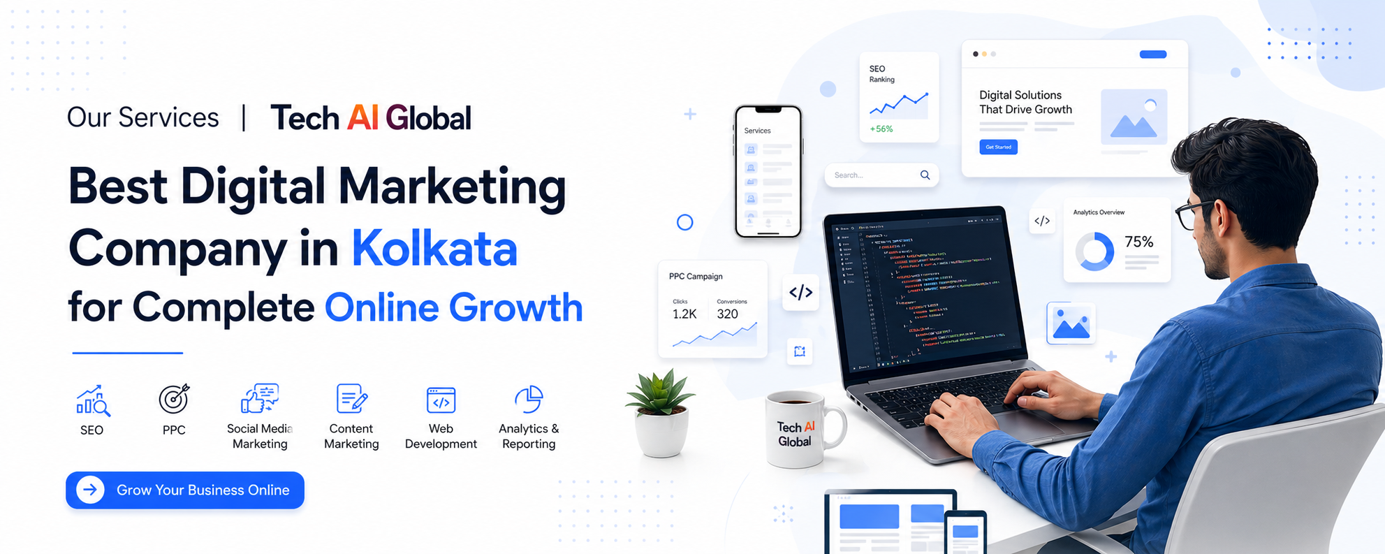 At Tech AI Global, we understand that navigating the digital world can be challenging. As a leading digital marketing company in Kolkata, we offer a full range of services designed to help businesses grow, compete, and succeed online.